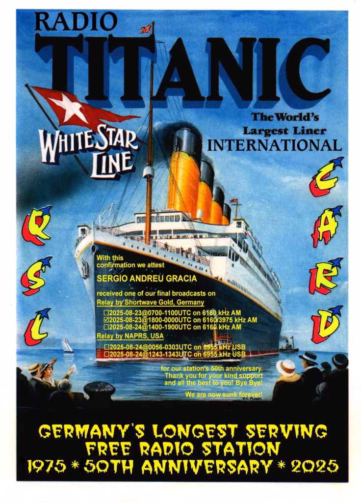 La larga espera por fin ha terminado. Muchas gracias por su paciencia. Aquí tiene su merecida respuesta a su informe de recepción, y nos complace enviarle hoy nuestra última tarjeta QSL, junto con información sobre la historia de nuestra emisora. Por cierto, recibimos más de 100 informes de recepción del último fin de semana. Le agradecemos su apoyo a nuestro proyecto de radio y nos despedimos. Como dice el dicho, mejor renuncie cuando se está en ventaja. Ha sido un gran placer volver al aire después de 25 años de silencio, pero tras un total de 50 años de actividad, es hora de retirarse, aunque muchos de ustedes deseen que nuestros programas continúen. No, ya se acabó; RADIO TITANIC INTERNATIONAL, «la emisora ​​de radio libre más longeva de Alemania», ha desaparecido del aire.