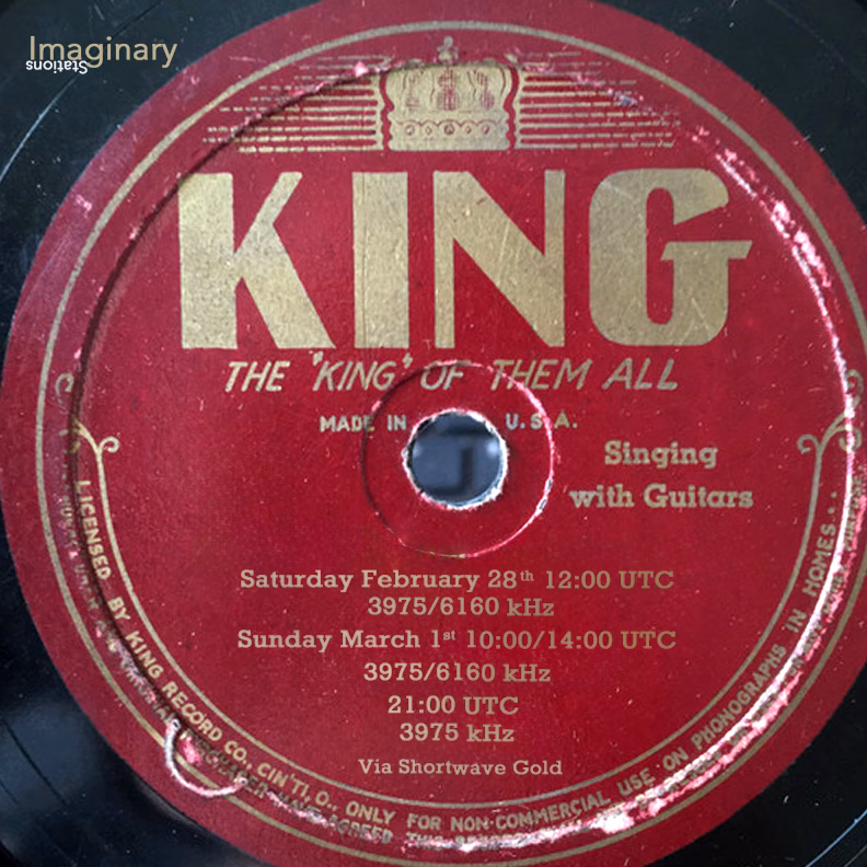 Imaginary Stations te trae un homenaje sonoro radiofónico a King Records. Sábado 28 de febrero a las 1200 hrs UTC en 3975/6160 kHz y luego nuevamente el domingo 1 de marzo a 1000/1400 UTC el 3975/6160 kHz y 2100 hrs en 3975 kHz (a través de los servicios de Shortwave Gold). King Records fue fundada por Syd Nathan en Cincinnati Ohio y contó con Country & Western, Rhythm & Blues, Rock & Roll, James Brown y mucho más de 1943-1975 y un maravilloso espectáculo tributo.
