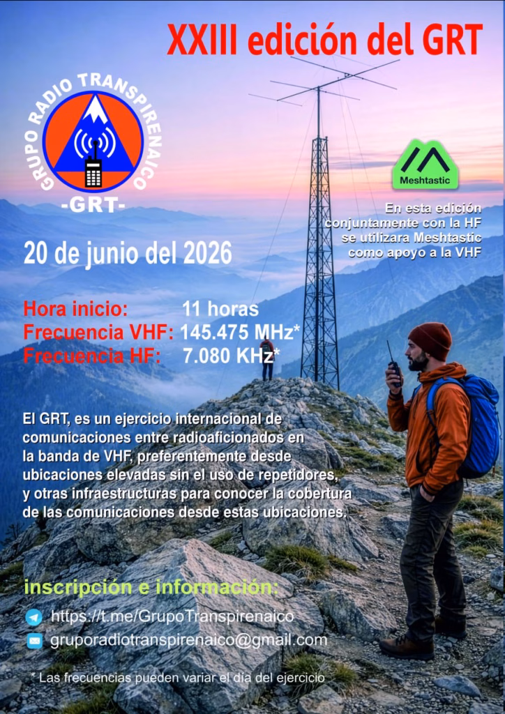 Aunque estamos todavía en invierno , los amigos de GRT ya están preparando todo para la edición veraniega de la actividad. Este año será el 20 de junio. Además en esta edición incluye la novedad del meshtastic como apoyo a las comunicaciones VHF. Todavía no están abiertas las inscripciones pero ya podéis ir pensando desde donde vais a participar y sobre todo cual será el menú del almuerzo. 73